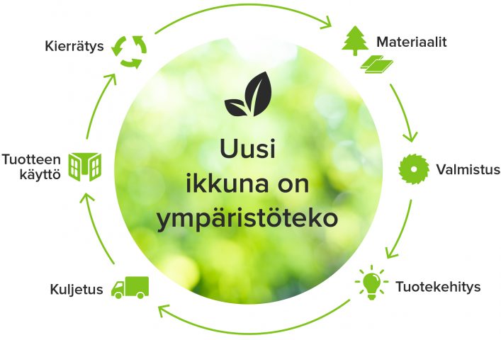 Ikkunoiden päämateriaalina käytämme FSC / PEFC -sertifioitua puuta, joka tekee ikkunasta huomattavasti ympäristöystävällisemmän. Käytämme myös Skandinaviassa vesivoimalla tuotettua alumiinia ja teemme läheistä yhteistyötä lasivalmistajien kanssa löytääkseen entistä energiatehokkaampia ratkaisuja.