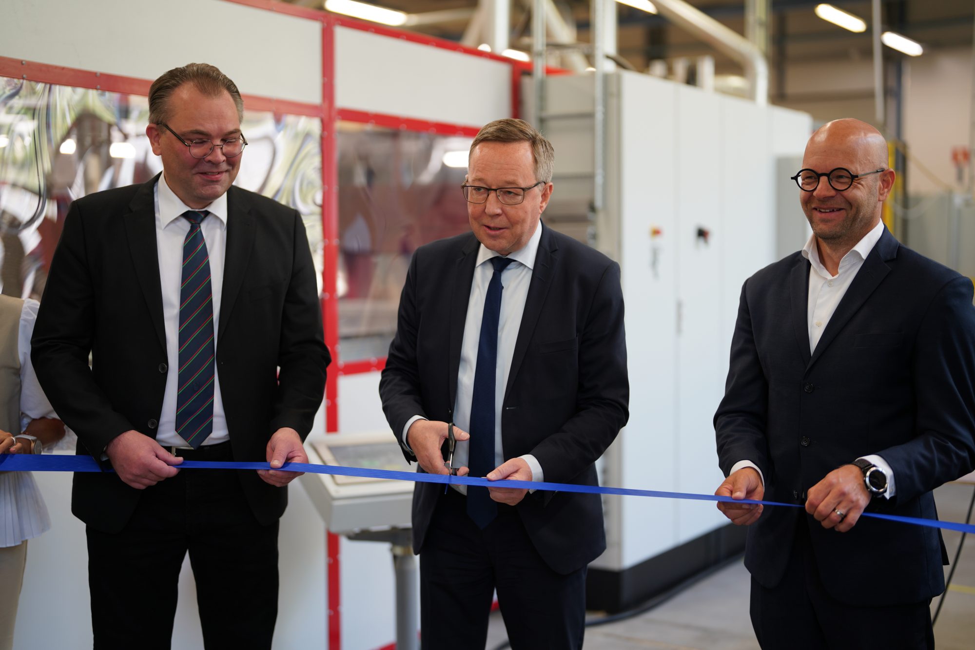 Ministeri Mika Lintilä vihki käyttöön uudistetun tuotantolinjan PihlaPROn Kannuksen tehtaalla.