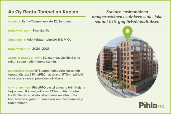 Ranta-Tampellan Kaplan on Suomen ensimmäinen omaperusteinen asuinkerrostalo, jolla on RTS-ympäristöluokitus. PihlaPRO pystyi ainoana toimijana tarjoamaan kohteeseen ikkunat, joilla on niiden koko elinkaaren huomioiva EPD-ympäristöseloste.